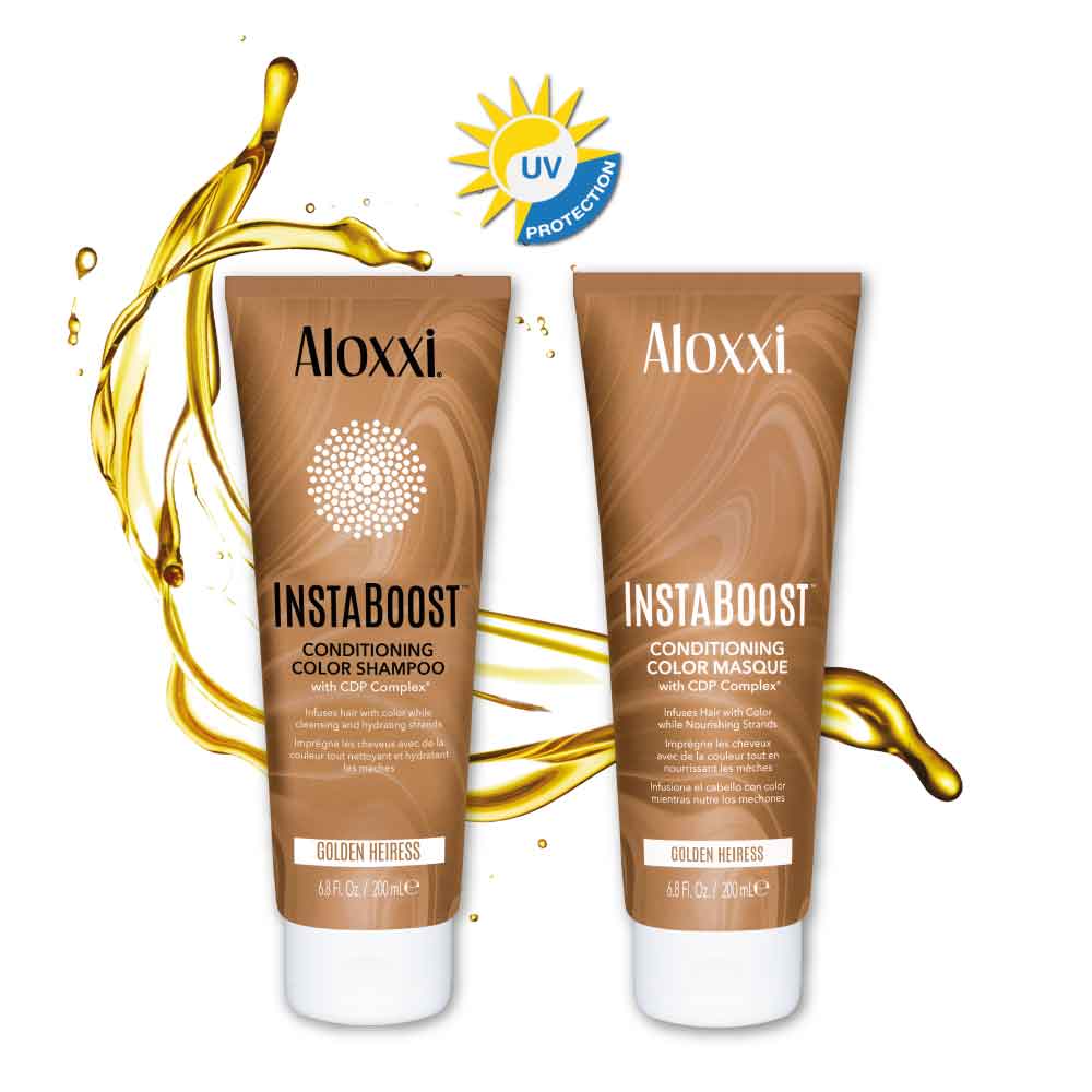 Il Kit Biondo Caldo Golden include uno Shampoo Gold con azione Ristrutturante e una Maschera Rigenerante biondo dorato Instaboost Golden Heiress